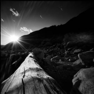 In the mountains north of her grave, I sat on this long dead log and let the day reach its close. The silence of the setting sun strongly called me to take a photograph, and as set up my pinhole camera I began to weep and said many things which my heart had desired to say to her.”